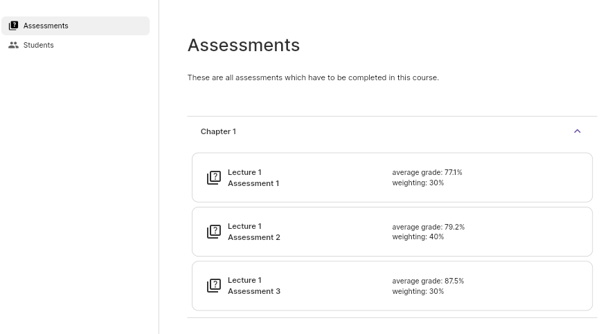 Track the average grade for each assessment across all enrolled students, giving instructors a clear picture of course difficulty and student performance.