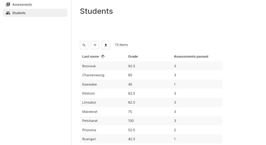 View each student's overall grade and number of assessments passed, making it easy to identify who needs support and who is excelling.